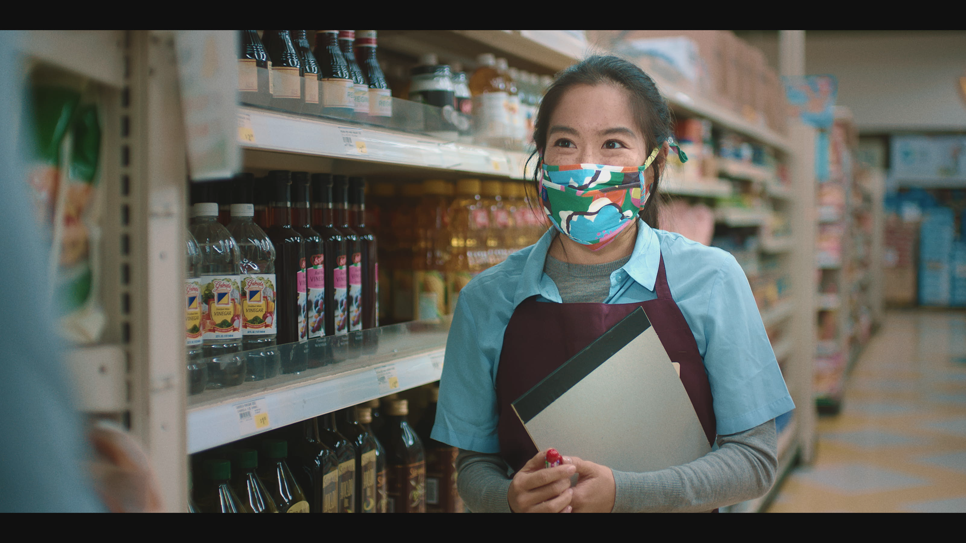 Liu brings the character of Amy’s Mom to life so vibrantly yet also with understated vitality, and it suits the character to a “T” while giving us someone we root for and against, but then for undeniably as the film progresses, thanks to the wonderful performance by Liu. Primary supporting turns are first made by Brenda Valencia and Seyi Ayorinde as Amy’s co-workers Mia and Norm, the latter of whom becomes a catalyst of change in Amy’s mother’s life and opinions about Blacks when a simple act of kindness hits home. Hidekun Hah is Mr. Park, the manager/owner of the small grocery store Amy works at whose resistant to her attempts to try and improve things for the store and its remaining employees but may end up with a change in heart himself. Jim Todd very much makes an impression via his turn as a local white man and store customer whose HIGHLY adamant attitude towards wearing masks and Asian Americans is made more than clear, likewise turning into a life-altering motivation for Amy to become the bigger person for others and herself.