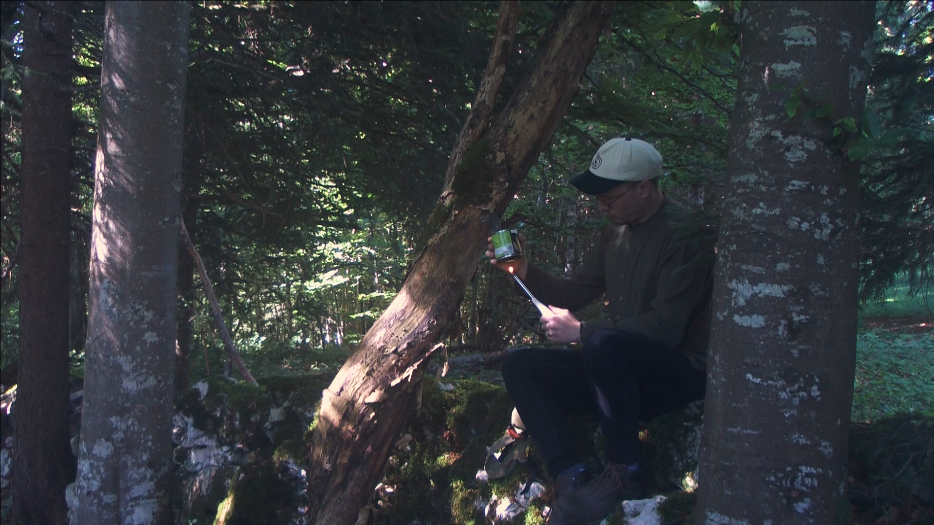 If that doesn’t speak to the nucleus that indie filmmakers, their fearlessly bold choices, and so often incomparable thematic ventures orbit around…what does? With no dialogue present, it is up to Boillat must rely on all he is doing on screen to bring across the film’s path, which he very much does with deeply understated yet strangely ( and quietly) profound energy through his role as the man here. On a totally unassuming, casual stroll through the woods, the man happens upon a backpack that ends up sending him on a road to discovery, perhaps even revelation, as items both inside the sack and also along the woodland way he’s treading upon cast their own tales of relevancy for him, some utterly evident in their use, others not so much even if obvious in what the items themselves are.